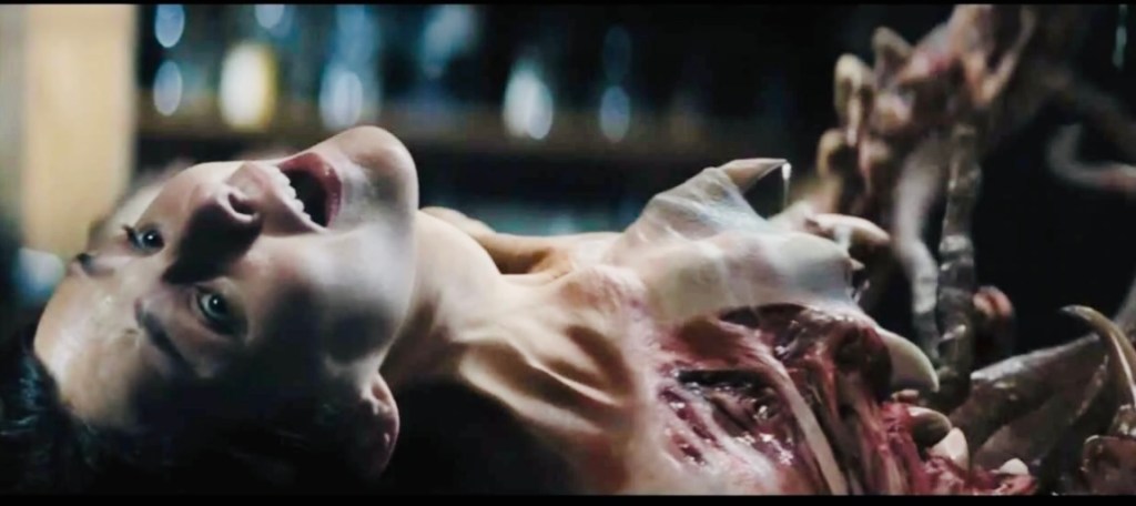 An autopsy scene reminiscent of the first movie shows their colleague inside the beast, mid absorption in a horrifying scene with use of practical effects providing a comparative feel to its predecessor. What their facing with then becomes apparent as The Thing unleashes itself again having taken on the human form of one of the scientists, before the body divides in half from the face down and tentacles shoot out to overcome its next victim. In this scene the horror is diminished slightly as the CGI effects look very computerised, and it is here where critics of the modern version take hum bridge when comparing to the original.