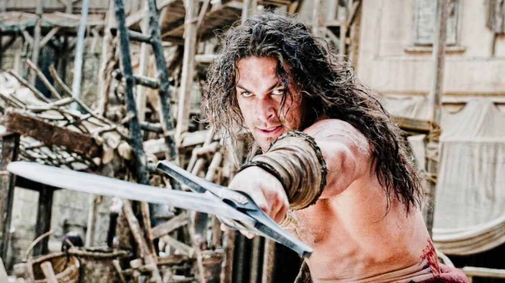 Conan spends the following years journeying the world and searching for the man who destroyed his village and killed his father. We jump forward to when Conan is a fully grown man, played by Jason Momoa (Game Of Thrones / Aquaman), who we see overrunning a gang of slave masters before partying into the night with his companions and the freed slaves, taking the spoils of the finest women amongst them. Their party is gatecrashed by soldiers and Conan recognises the captain as the man who’s nose he sliced off as a child. He gives himself up to slavery in order to get close, then easily overruns his captors and tortures the captain in a memorable gruesome scene where he pushes his fingers into the hole where his nose used to be.