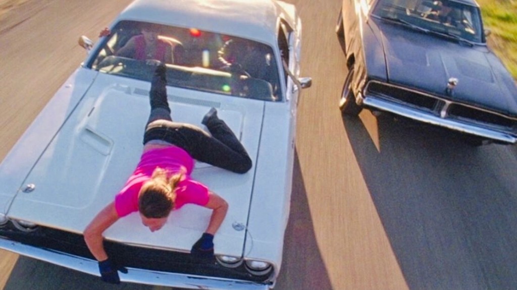 Death Proof then jumps forward 14 months to a small town in Tennessee, where we again meet Mike who has recovered from the injuries of his earlier crash-carnage, and is stalking yet another group of young females inc Abbie (Rosario Dawson – Sin City), Kim (Tracie Thoms – Raze) and Lee (Mary Elizabeth Winstead – 10 Cloverfield Lane). The girls pick up Zoë Bell (Uma Thurman’s stunt double from Kill Bill, playing herself), and it transpires they all work in the film business and are on a local shoot. As it’s a day off from filming Zoë orchestrates the test drive of a 1970 Dodge Challenger, the car used in the classic exploitation film Vanashing Point (1971), and wants to play a game called ‘Ships Mast’, which involves her climbing out of the window onto the bonnet of the car, for a high speed thrill ride.