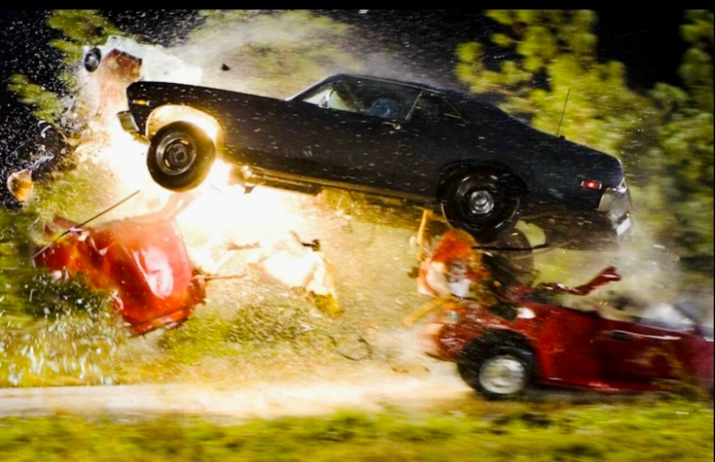 Mike it transpires is a cold blooded serial killer, and this is a slasher flick in which his Chevrolet is the dagger! The passenger side of his vehicle has no seat belt and is self contained in its own roll cage, and as he throws the car around Pam smashes her head against the sides until he finally pulls an emergency stop, and delivers a fatal blow as she hits the shatter proof windscreen scene with force. Mike then hunts down the vehicle that Julia and Butterfly are driving home in and head on collides with them at great speed, causing each girl to die under horrific circumstances. There is some great practical gore from Tarantino in this scene, including the leg severing of Julia as she had been riding shotgun with her foot hanging out of the cars window.
