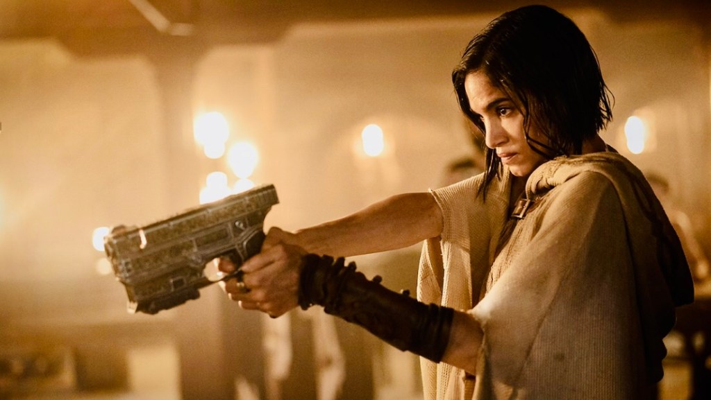 Within these opening few moments you cannot help but think of both Dune and of course Star Wars, and Rebel Moon unashamedly wears the influence of these two giants of Sci-Fi on its sleeve. We are then introduced to a village on a rural planet where the mysterious Kora (Sofia Boutella – Climax) is living a simple life within a farming community. The society has a Viking feel to it where offerings are made to gods in return for a good harvest and the civilisation seem very primitive.