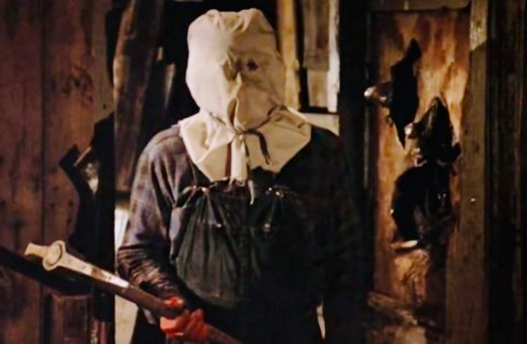 But it transpires that Jason did not drown as first thought. In a spooky camp-fire story the cast are told that his body was never found, and that he has actually been living in the woods surrounding Camp Crystal Lake for all these years. And having witnessed the death of his mother, he was now primed to take his own revenge. After murdering Alice he returns to his home, and five years later begins killing when his peace is interrupted by a new set of unsuspecting camp-counsellors. But this isn’t the Jason we know and love. As having not yet acquired his iconic Hockey Mask, he simply wears a basic sack over his head.