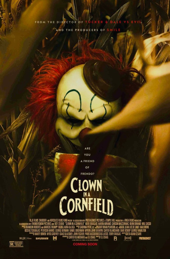 Clown In A Cornfield is a hugely successful 2020 novel written by Adam Cesare (Video Night), which won the Bram Stoker Award for Best Young Adult Novel in Horror the year of its release. It’s popularity has seen Cesare write two sequels to complete a trilogy of novels so far, as well as swiftly selling the movie rights to Temple Hill Entertainment – who have previously brought us the divisive Twilight Saga, as well as the two Smile films in recent years. Eli Craig (Tucker & Dale Vs. Evil) was brought in to direct the adaptation, and the film stars Katie Douglas (Lazareth), Aaron Abrams (Hannibal) and Kevin Durand (Abigail / The Strain).