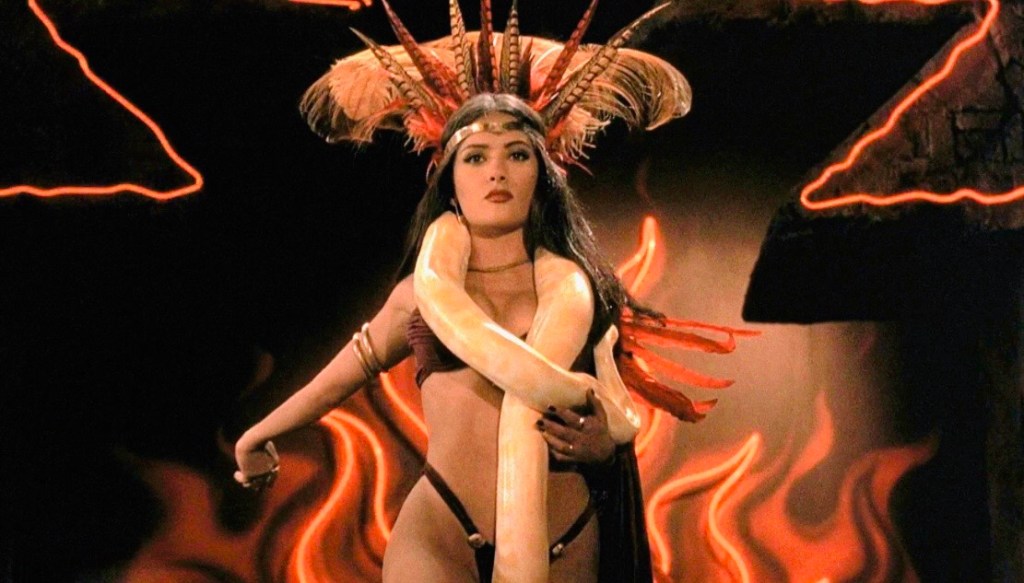 The unforgettable turn follows the hypnotic dancing of ‘The Mistress of the Macabre’ – Santanico Pandemonium (Salma Hayek – The Faculty) – who’s metamorphosis into a bloodsucking creature when violence and bloodshed breaks out in front of her, sees all hell break loose in the tavern. From here, the movie plays out as a survival-siege Horror, paying homage to the exploitation cinema of the 70s and 80s, as well as directors such as John Carpenter (Assault On Precinct 13), Sam Raimi (The Evil Dead), George A. Romero (The Night Of The Living Dead), and Lamberto Bava (Demons).